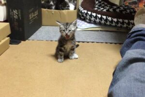 柵のある窓のようなところの向こう側には、この子猫のお母さんがいるようで、子猫が立ち上がっている姿を見たらすぐに子猫のいる側に行こうと、通り抜けられそうな柵の場所を探しています。