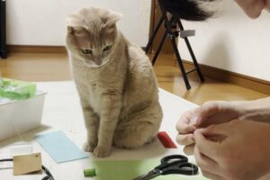 この茶トラの仔猫も、このお家にやってきてすぐにむぎくんに、こんなふうにべったりになりました。むぎくんがトイレに入っている時も、どこにいても、常に仔猫が至近距離にいて、じっとむぎくんのことを見つめているのです。