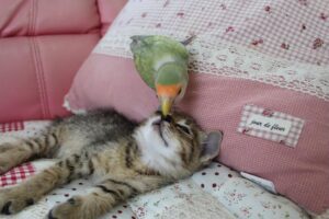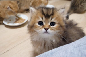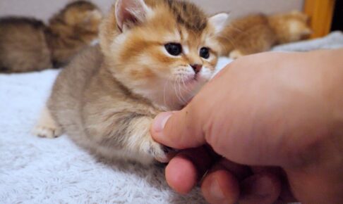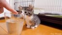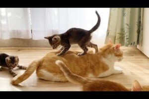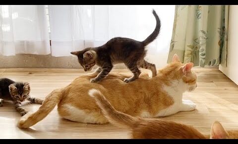 途中柱を越えようとして危険な場面もありましたが、茶トラ猫ちゃんにびびる様子はありません。