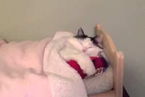 この日は、外の天気は悪く雷も鳴っているようです。突如、大きな雷の音が鳴り響き子猫は、初めての経験だったこともあり、びっくりして思わず体を起こしてしまいました。