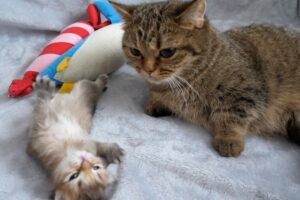 二匹は同じぐらいの年格好なので間違いなく兄弟か姉妹ですね。それにしてもこの子猫たちは、どんな種類の猫なのか気になるところです。