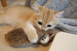 まるでテディベアのようなモコモコな猫がベッドの上に座っています。動きも鈍くて、なんとなくテンションも低めです。