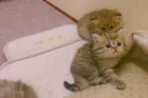 そんな爆睡中の子猫をお父さんはそっと両手ですくうようにして床の上に移動させてみました。両手のひらですっぽり包めるほどの子猫ですから、その大きさは本当に小さいのがわかります。