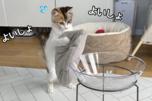 さて、こんどはジャラシで遊んでもらっています。お兄ちゃんが猫じゃらしを投げると豆大福は悠々とゆっくりとした歩き方でジャラシをゲットして戻ってきました。