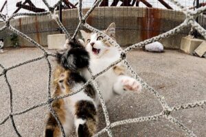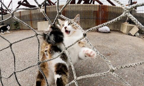 ものすごい勢いで集まった猫たちは、遠慮なしにグイグイ・・・。