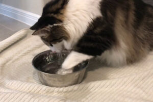 次のシーンでは庭でほかの子猫たちといて母猫が遠くから話しかけていますが、子猫のほうは落ち着かないのか謎の動きをしています。