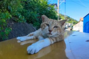 しばらく試行錯誤していたまるちゃんは、何度かのトライのあと見事ハンモックに乗ることができました!揺れるハンモックに横たわりドヤ顔のまるちゃんです。