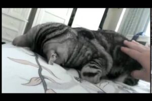 何事かと思ったら、なんとゴールデンのベッドをシルバータビーの子猫が占領していたのです。自分のベッドがこんなにちびたな猫に横取りされてしまってショックを隠せない様子です。
