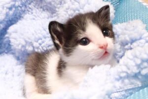 ベッドの上の毛布にくるまっている茶トラ子猫のひろし。飼い主さんがひろしのことを呼んでも、警戒しているようにただじっとそこから動きません。