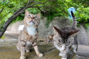 男性が大きく足踏みをしながら前へ出ていくとすぐに子猫は追いつこうとして必死になっています。開いた両足の間を子猫がくぐりぬけてきた時の顔は可愛すぎて言葉を失うほどです。
