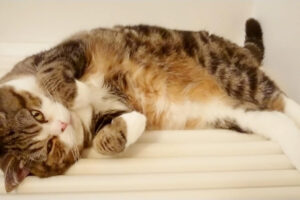 そんなおばあちゃん犬ひかりのそばに寄り添っているのは子猫のミルキーです。ヒーターのそばがポカポカ暖かいのでひかりも心地良さそうに昼寝をしています。