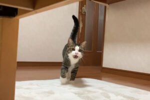 窓際へのジャンプに失敗したお母さん猫に驚いて子猫たちが一斉にダッシュ!