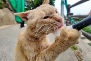 場面は変わって、ねこタワーに寝ている子猫のしまちゃんにも同じことをしてみたら遊びたい盛りなので顔を埋めると遊ばれてしまいました。