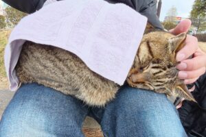 女性の手の大きさと比較すると、どうやらこの三毛猫さんはまだ子猫なのかもしれません。