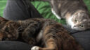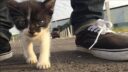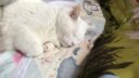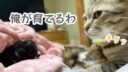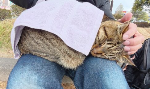 ママのエプロンのポケットのなかにすっぽり入り込んでいるのは子猫のトワです。このまま洗面台のほうに連れて行ってこれからシャンプーをします。