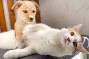まったりしていたママに猫パンチするいたずらっ子な子猫
