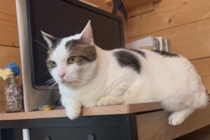 このように、落ち着きがない5匹の保護猫たちとは対照的に、先住猫のほうはじっと様子を伺いながら対応する姿に貫禄があります。
