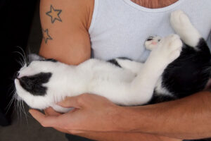 赤ちゃんに気づいて後退りをして逃げるニャンコ