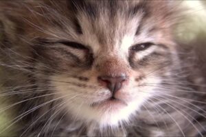 まだ子猫というにはかなり小さく赤ちゃんですね。黒っぽい赤ちゃん猫とベージュの子はケージの中で寝ていますが三毛の子だけはケージの外に興味津々です。