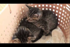 起きあがろうと必死にもがきはじめる子猫ですが、両隣を兄弟猫に囲まれているのでなかなか起き上がることができません。