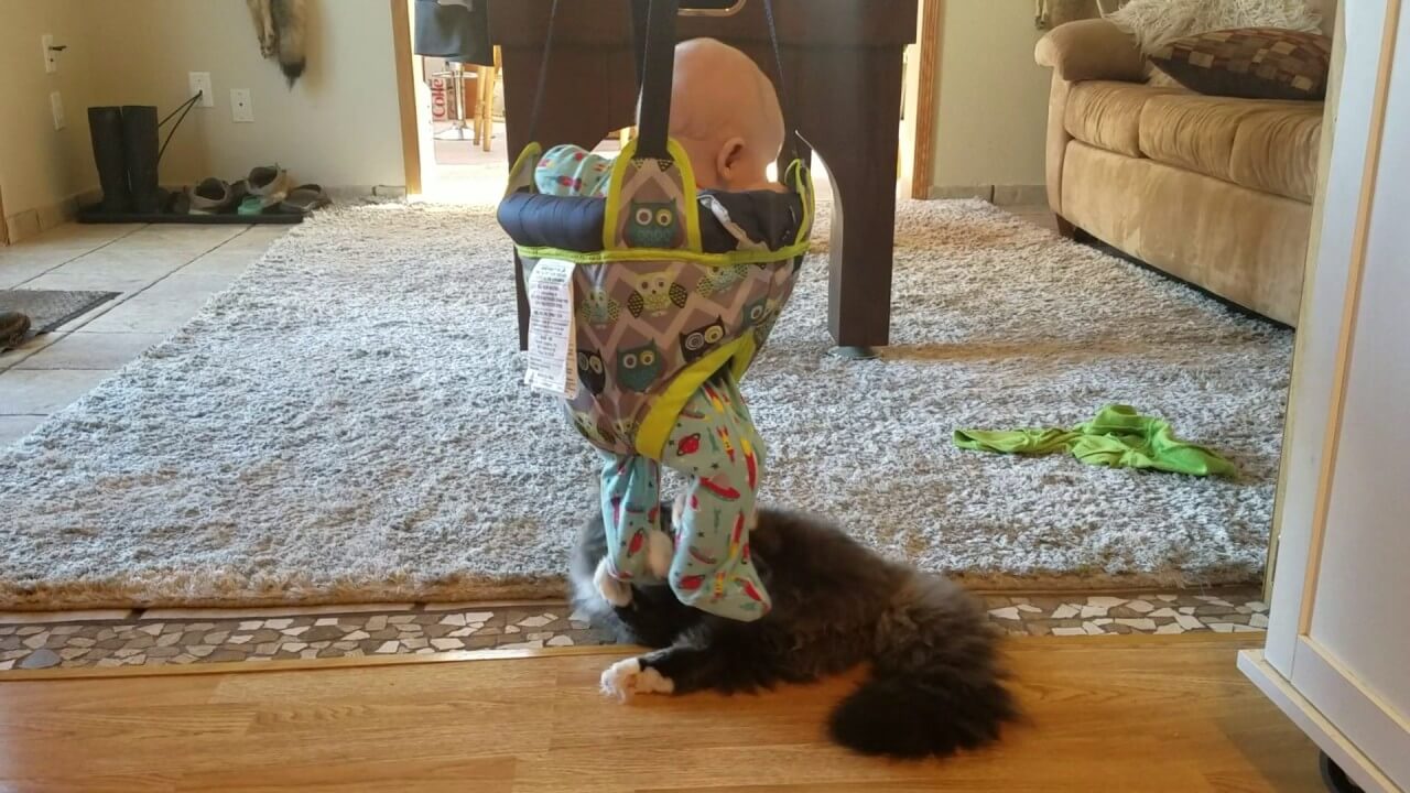 赤ちゃんがスイングジャンパーに乗ってゆらゆら揺られていると、そこへ飼い猫がやってきて揺られている赤ちゃんにじゃれつき始めました。