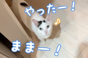 最後はそのまま、ベッドの手前で座り込んで動画が終わりますが、終始猫ちゃんを応援したくなる癒し動画なのでした。