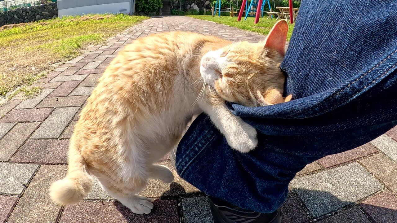 甘えた声で鳴きながら甘えてくる茶白猫さんがとてもフレンドリーで可愛いです。背中を何度も撫でてあげると、嬉しそうにしています。