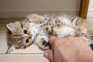 子猫のアッシュちゃんがベッドのなかで相棒のモーちゃんを寝かしつけています。