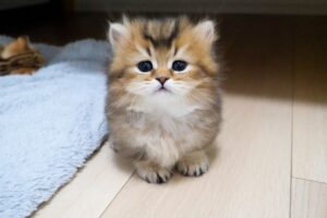 そこで飼い主さんがキキのことをそっと持ち上げて上の段にいるお母さん猫のベッドの上に置いてあげました。
