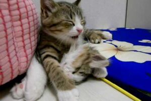 ベッドの上で可愛い赤ちゃん猫が2匹寄り添っています。どちらの赤ちゃん猫も、まだ目が完全に開いておらず、しょぼしょぼとした半開きになっています。