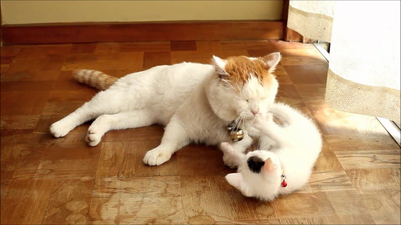 優しいしろさんは、子猫のことを舐めてあげたりして結構可愛がってあげています。