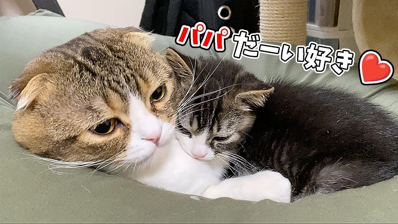 父猫ぽこ太郎にべったりくっつき、甘えまくるうま次郎。