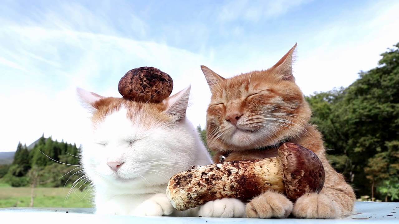 今回は、なんとまぁ立派なまつたけを頭の上に乗せてまったりしているしろさん、そして手の上に巨大な松茸を乗せている茶トラ猫さんです。
