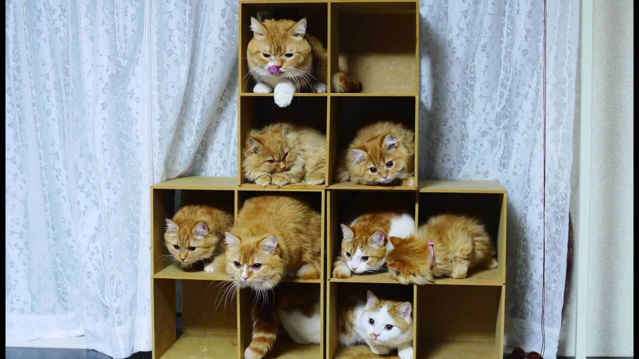 マンチカンの大家族がマンションの個室でそれぞれくつろぎます