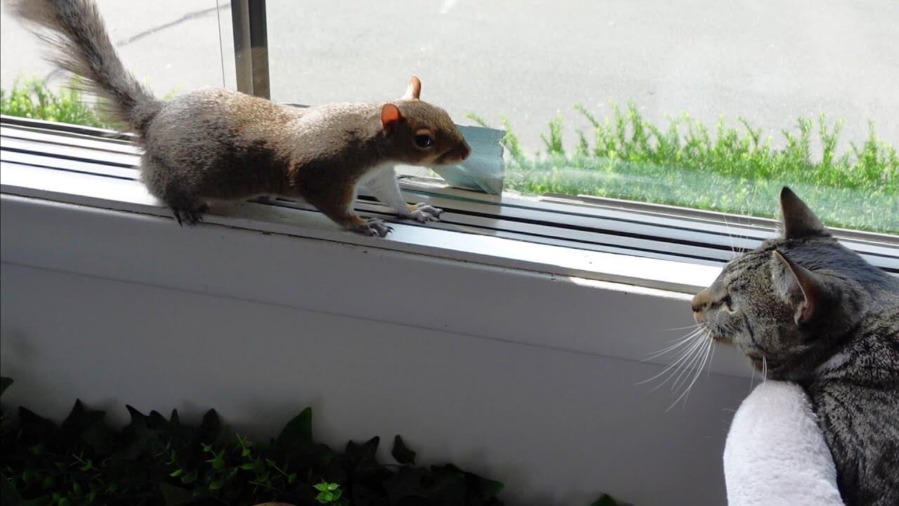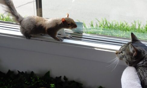 今回ご紹介するのは猫の姿を見て驚きまくるリスです。