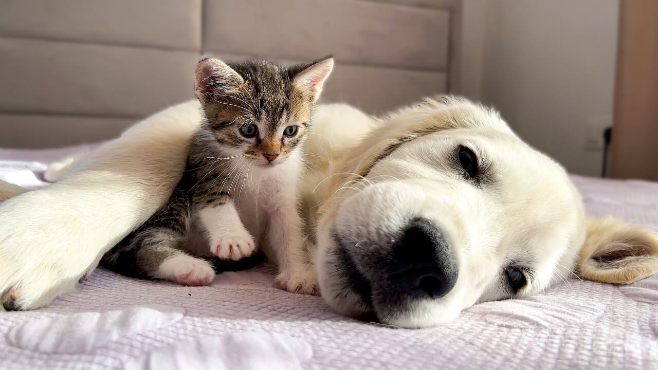 ぐっすり眠っているゴールデンレトリバーの仔犬のそばにちょこんとひっついているのはキジトラの子猫です。