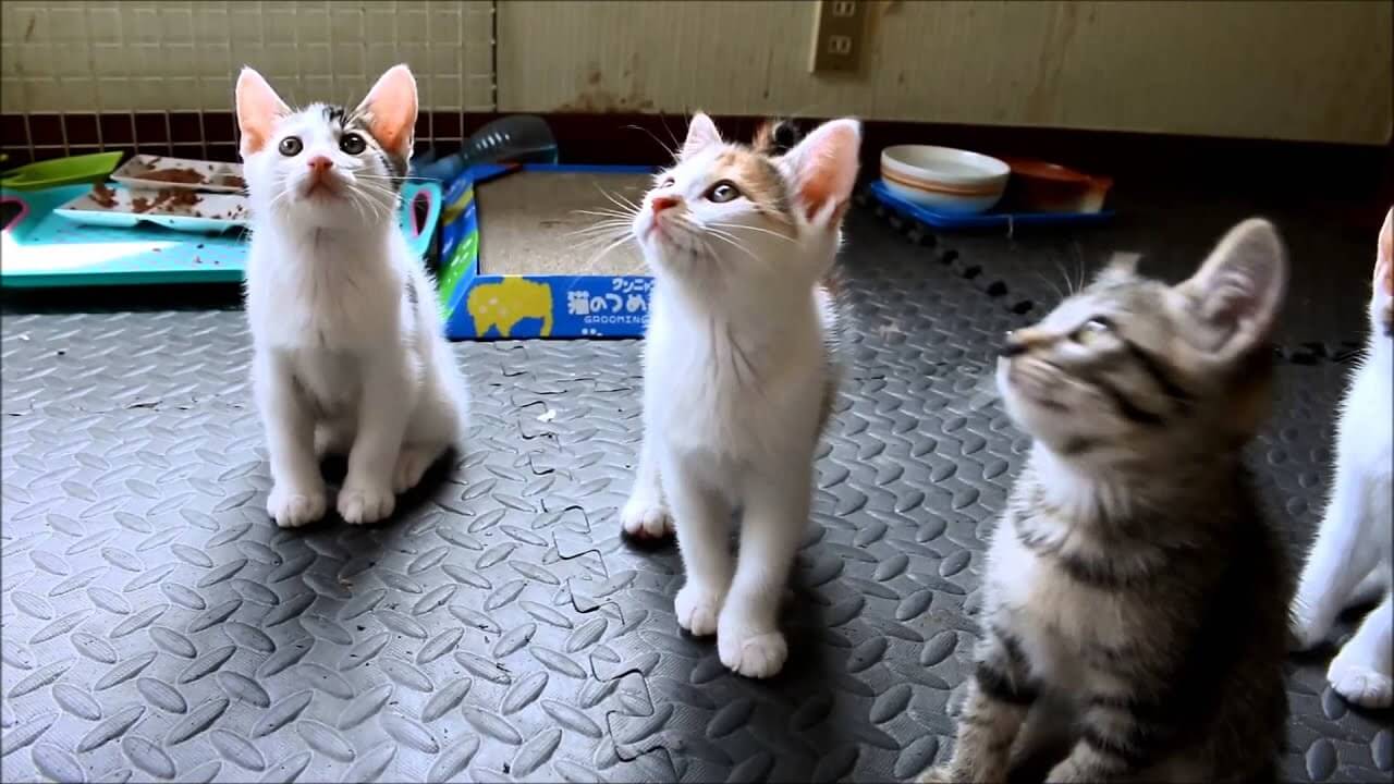 シマ家の子猫たちが猫じゃらしに飛びついて遊んでいます。飼い主さんが動かす猫じゃらしが動くほうこうへ、みんなが一斉に動いては飛びつくという遊びを繰り返しています。