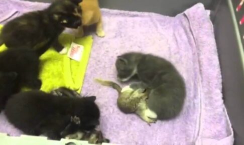 ママ猫には赤ちゃん猫たちがべったりくっついています。ママも子供たちのお世話に大忙しです。でもなんだかちょっと様子がおかしいですね。