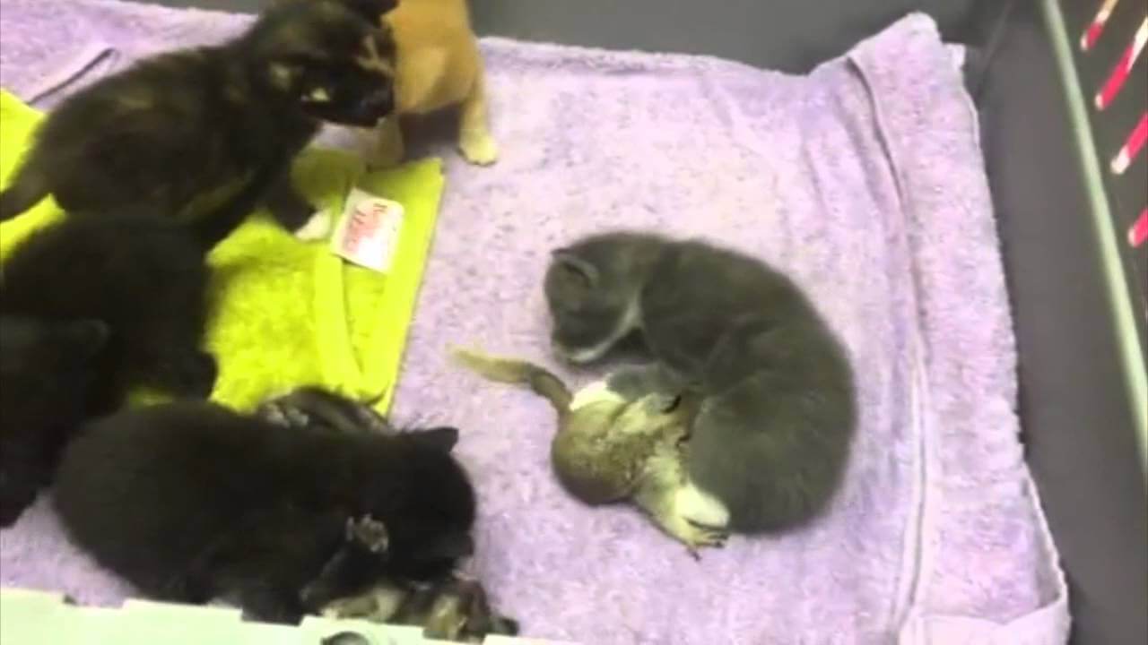 赤ちゃん猫たちがママ猫のお腹に群がっておっぱいを飲んでいると、子リスも一緒に仲間に加わろうとしています。まんぷくになった赤ちゃん猫たちと子リスはみんな仲良くしています。