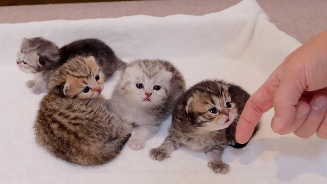 赤ちゃん猫たちの可愛さに飼い主さんも、ナデナデする手が止まりません。横一列になっている赤ちゃん猫たちは、静かにその場から動かずおとなしくしています。