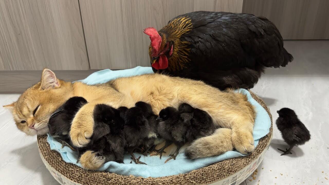 いったいどうしてひよこたちは母鶏よりも子猫の方を選んだのでしょうか。その理由もわかりませんが、とにかくひよこたちは子猫と一緒に昼寝することを選んだようです。