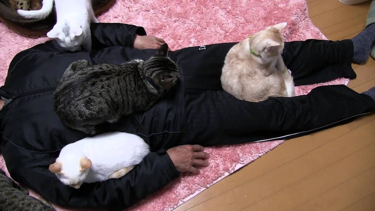 寝転がったお父さんの上には猫たちが大集合!
