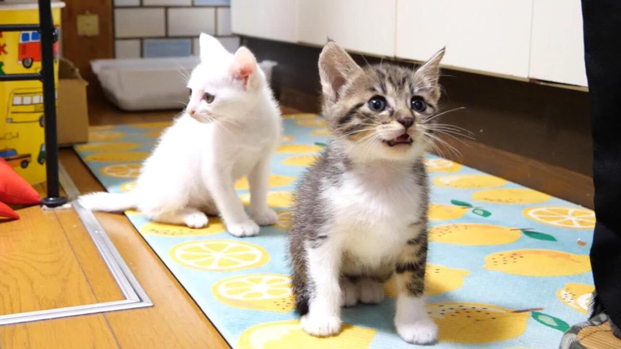 子猫兄妹のピヨちゃんとユキちゃんが、二匹同時にピーピーと鳴きながらごはんの催促をしています。