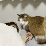 ニャンコさんは赤ちゃんのすぐそばにやってきて長いしっぽをゆっくりとユラユラさせながら歓迎ムードです。