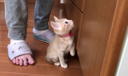 しばらくすると飽きたのか、飼い主さんの足にしっかと捕まります。
