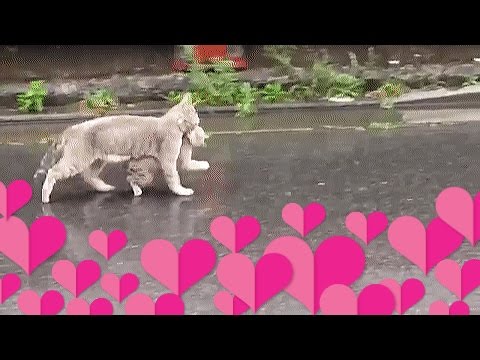 大雨のなか子猫をくわえて避難する母猫