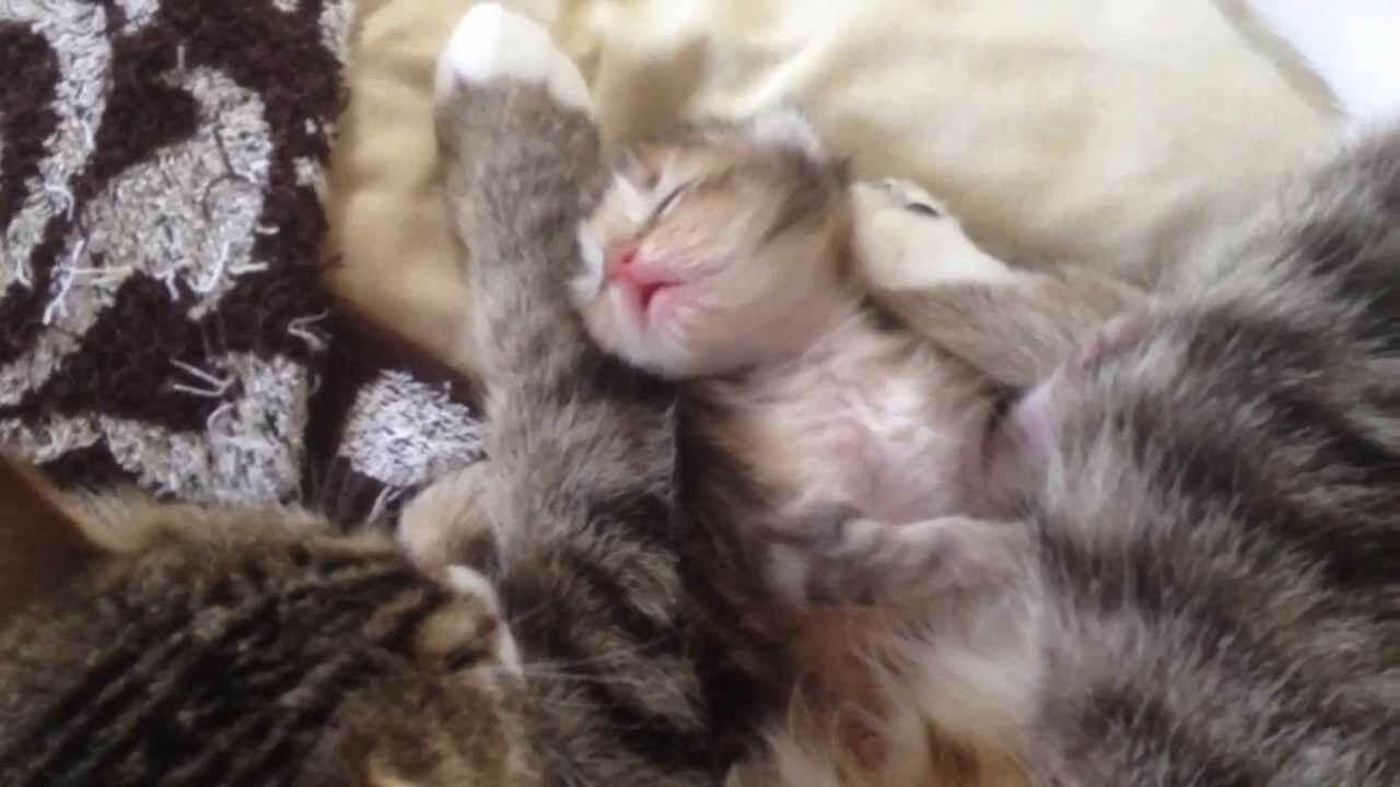 熟睡しているので時折ピクピクと痙攣するみたいに前足を震わせたりしています。お母さん猫のそばにいるので、すっかり安心して深い深い眠りに落ちているのでしょうね。