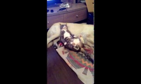 ワンコのお腹でのんびりくつろぐ猫