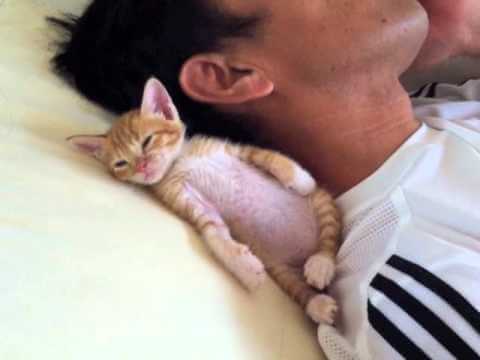 お父さんの首のところにぴったりくっついて寝ている子猫のひよ。この時からすでにパパっ子のひよです。