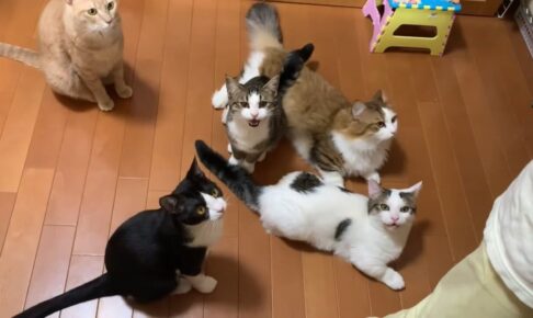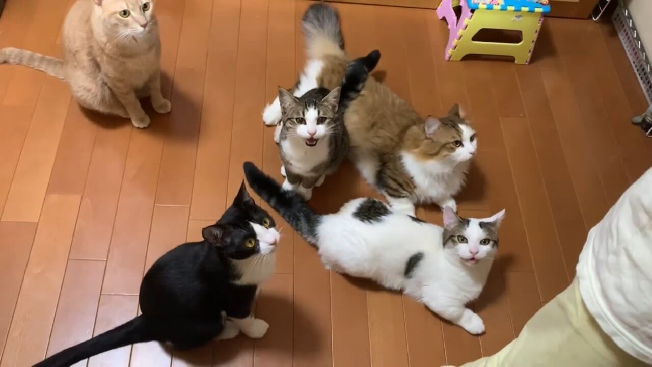 娘ちゃんがキッチンに立っているとニャンズが続々と集まってきました。おやつがもらえるという期待感でワクワクソワソワなニャンズたちです。